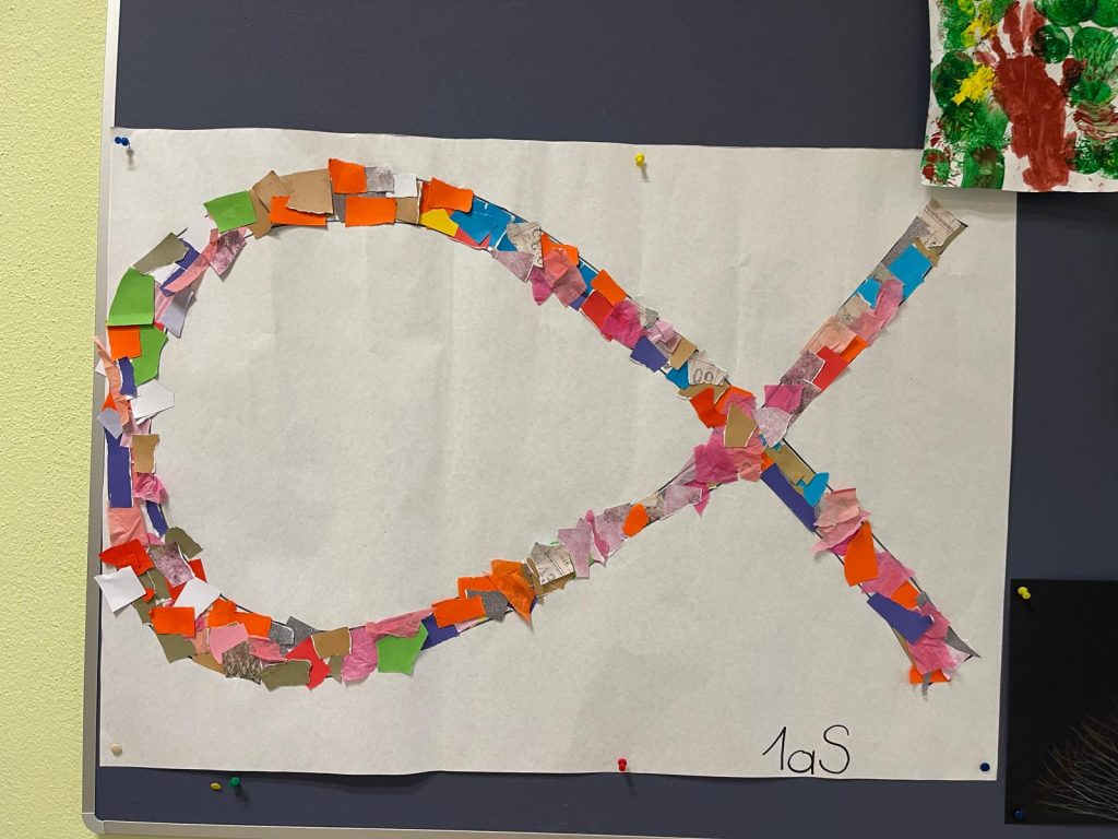 Als kreativen Abschluss durfte jede Klasse ein großes Symbol gestalten. Mit vielen bunten Papierresten haben die Kinder eine Taube, ein Kreuz und ein Fischsymbol zum Leuchten gebracht.
