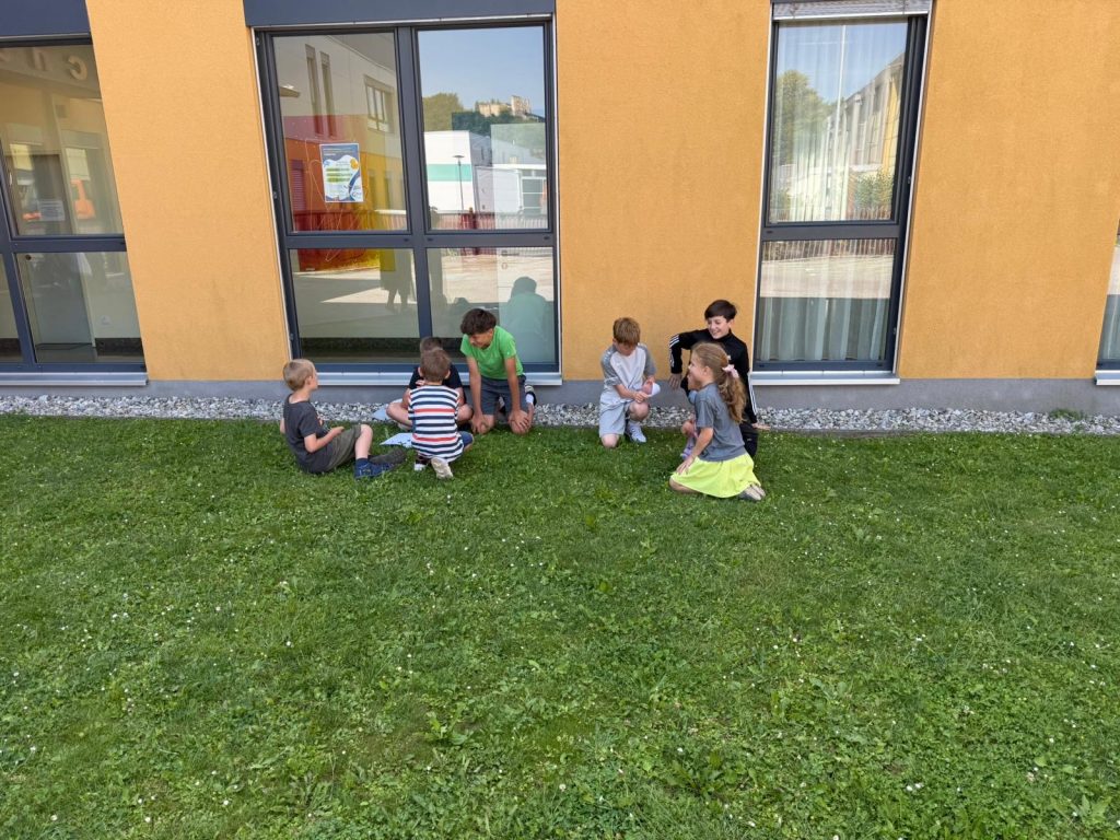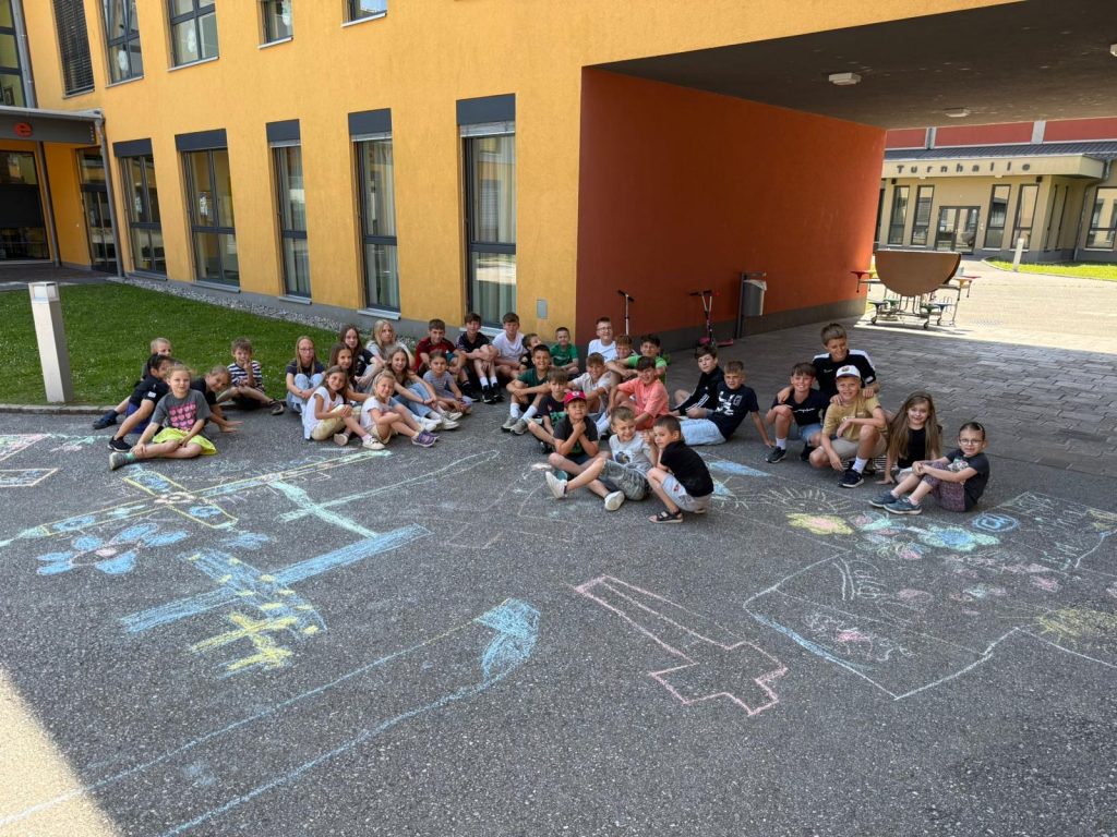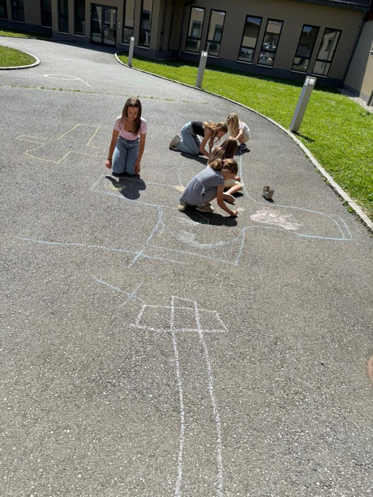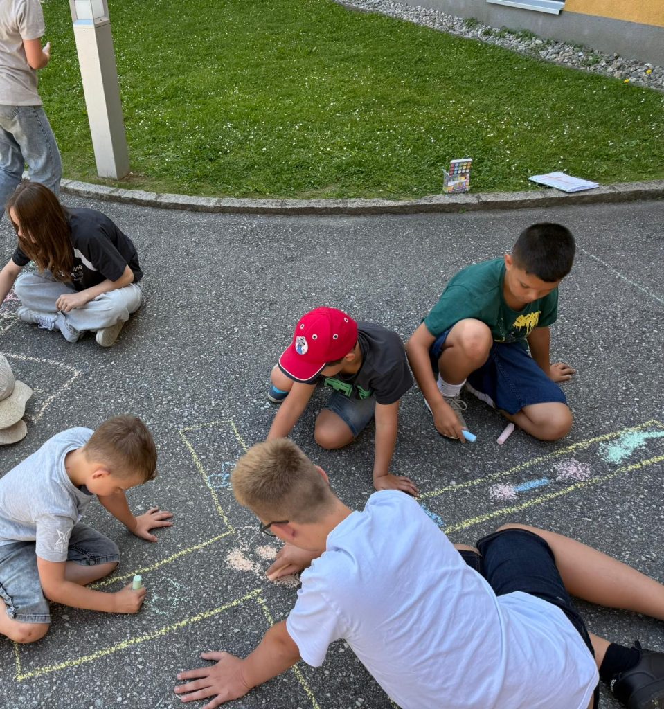 Mit viel Freude und Engagement gestalteten die Kinder gemeinsam farbenfrohe Fronleichnamsteppiche mit Straßenkreiden – inspiriert von der Tradition der festlich geschmückten Wege für die Fronleichnamsprozessionen.